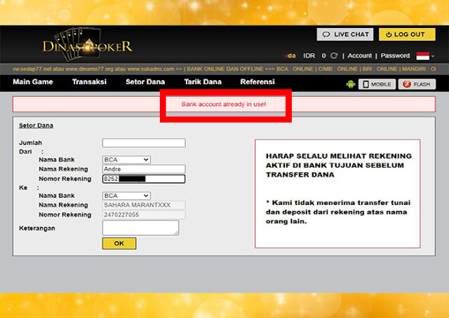 Cara Deposit Togel Lewat Dana. Bila bettor sudah terdaftar dan login di situs togel resmi, namun belum ada saldo buat betting maka pastikan anda sudah mengisi saldo akun togel resmi lebih dahulu. Jika belum dan masih bingung bagaimana cara deposit, ikuti tutorial berikut ini: Buka aplikasi resmi dana idn poker, lalu tinggal login dengan nomor. Bagi Anda para pemula, ada satu hal yang perlu dimengerti yakni pemilihan bandar togel. Jadi, perlu diketahui jika untuk tata cara deposit yang selalu digunakan bandar adalah metode via rekening bank. Untuk dua metode lain, pulsa dan e-wallet, itu hanya tersedia di bandar tertentu saja.